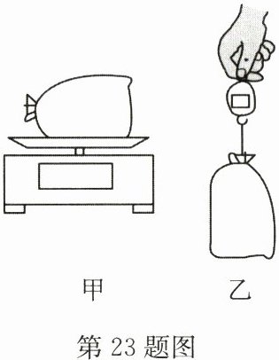 23. (6 分)小明用家里的器材探究重力的大小与质量的关系。如图甲、乙所示,小明用布袋装着质量不同的米,用电子秤测其质量,用液晶屏拉力器测其重力,实验数据记录如表。