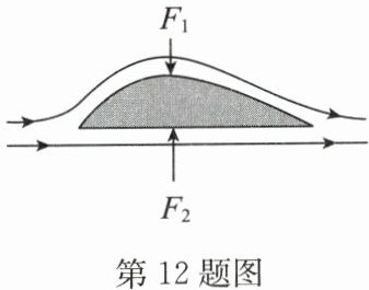 12. 如图所示为飞机机翼横截面的大致形状,飞机前进时,机翼与周围的空气发生相对运动,相当于气流迎面流过机翼. 在相同的时间内机翼上方气流通过的路程较长,因而速度较大. 这样,机翼上表面受到的压强