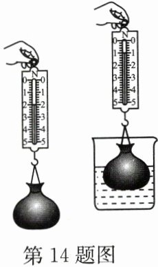 14. 如图所示,为了验证阿基米德原理,小明在一只塑料袋(塑料袋很轻、很薄)中装入大半袋水,用弹簧测力计测出盛有水的塑料袋所受重力的大小. 再将塑料袋慢慢浸入水中,观察到弹簧测力计的示数变