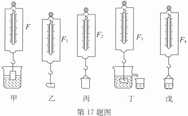 的关系.(2)如图乙、丙、丁、戊所示是“探究浮力的大小跟排开液体所受重力”的关系实验. 图乙中把不溶于水的小石块竖直悬挂在弹簧测力计下,弹簧测力计的示数为 $ F_1 $;图丙中把空小桶竖直悬挂在弹簧测力计下,弹簧测力计的示数为 $ F_2 $;图丁中把挂在弹簧测力计下的小石块浸没在盛满水的溢水杯中,弹簧测力计的示数为 $ F_3 $;图戊中把盛有溢出水的小桶竖直挂在弹簧测力计下,弹簧测力计的示数为 $ F_4 $. 当实验中的测量结果满足