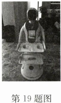 19. (9 分)如图所示为某饭店购买的送餐机器人,该机器人的质量为 80kg. 空载时它对水平地面的压强为 $ 1×10^5Pa $,该机器人最多可负载 20kg 的重物,g 取 10N/kg. 求: