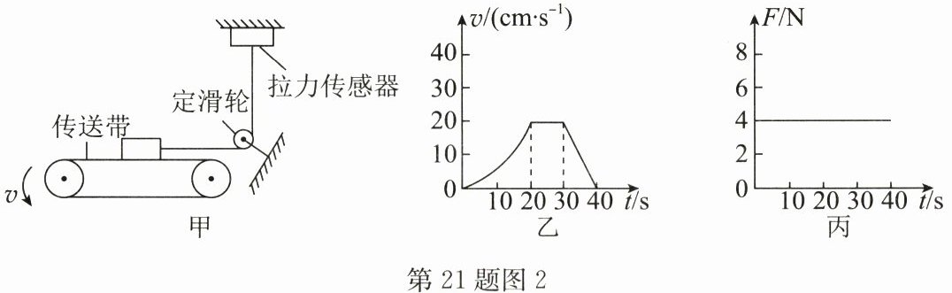 (4)小雨猜想滑动摩擦力大小还与速度大小有关.她设计了如图2甲所示的实验装置,传送带速度可以自由调节,物块始终相对地面静止,拉力传感器可以显示拉力大小.改变传送带速度,根据实验数据分别绘制出传送带的速度与时间(v-t)和拉力与时间(F-t)的关系图像.分析图2乙、丙两图可知,滑动摩擦力的大小与物体相对传送带运动速度的大小