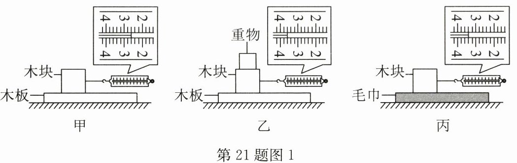 21. (6分)小雨在做“探究影响滑动摩擦力大小的因素”实验时,结合生活中的现象,猜想影响滑动摩擦力大小的因素可能有:
