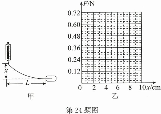 24. (6分)小明弯曲手中的钢锯片,感觉到弹力大小与钢锯片的弯曲程度有关,他猜想:弹力大小可能还跟钢锯片的长度有关.于是,他和同学合作进行了探究.如图甲所示,将钢锯片夹在厚书内,伸出的长度(简称长度)用L表示,钢锯片的形变量(弯曲程度)用末端偏移量x表示,钢锯片的弹力用F表示,其大小等于弹簧测力计的读数.