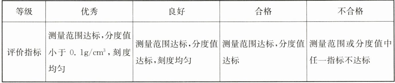 (写出是哪个设计,什么等级),依据是测量范围达标(测量范围为0.1~2.4g/cm³),分度值为0.1g/cm³,刻度均匀,但分度值没有小于0.1g/cm³