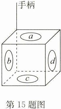 15. 如图所示,在透明密闭正方体塑料盒的上、下、左、右四个面的中心处挖出四个大小相同的圆孔,在孔的表面分别蒙上相同的橡皮膜 $ a $、$ c $、$ b $、$ d $. 抓住手柄将塑料盒竖直浸没到水中后静止.