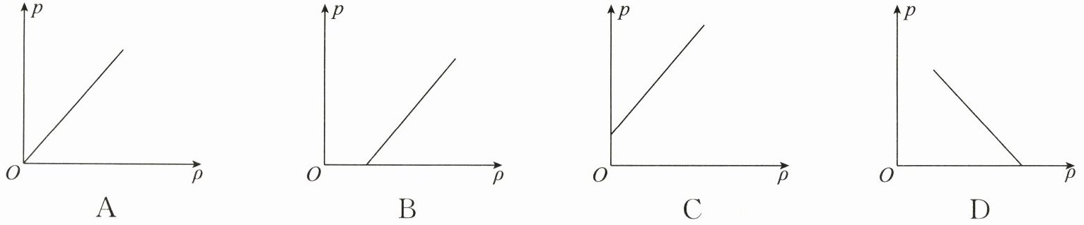 12. 将一容器放在水平桌面上,容器中装有一定体积的液体,液体的密度为 $ \rho $,容器对水平桌面的压强大小为 $ p $. 下列图像中能反映压强 $ p $ 与液体的密度 $ \rho $ 之间关系的是(