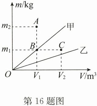16. 三个实心小球 $ A $、$ B $、$ C $ 和甲、乙两种液体质量与体积的关系如图所示.