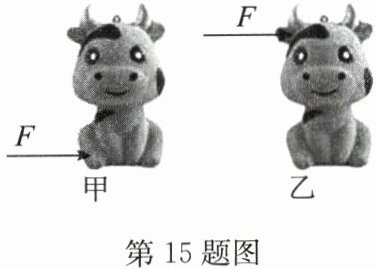15. 如图甲所示,当用水平推力轻推玩具小牛的底部时,玩具小牛沿桌面平稳地移动;如图乙所示,用同样大小的水平推力轻推玩具小牛的耳朵时,玩具小牛“翻了”,这是力的