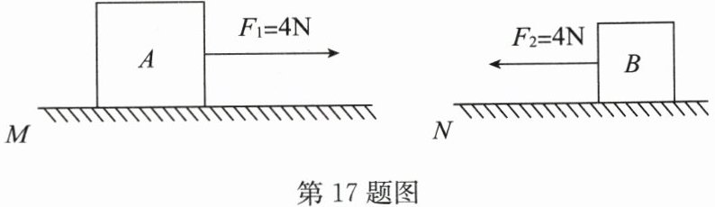 17. 物体 A、B 表面材质相同,分别位于水平桌面 M、N 上,已知 M 比 N 更粗糙。现分别用力 $ F_1 = 4N $、$ F_2 = 4N $ 拉 A、B 做匀速直线运动,如图所示。已知物体 A、B 的质量分别为 $ m_A $、$ m_B $,所受的摩擦力大小分别为 $ f_A $、$ f_B $,则 $ f_A $