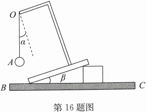 16. 如图所示是和重力有关的实验,缓慢改变支架底座的倾角 $ β $,悬线 OA 和图中虚线的夹角 $ α $