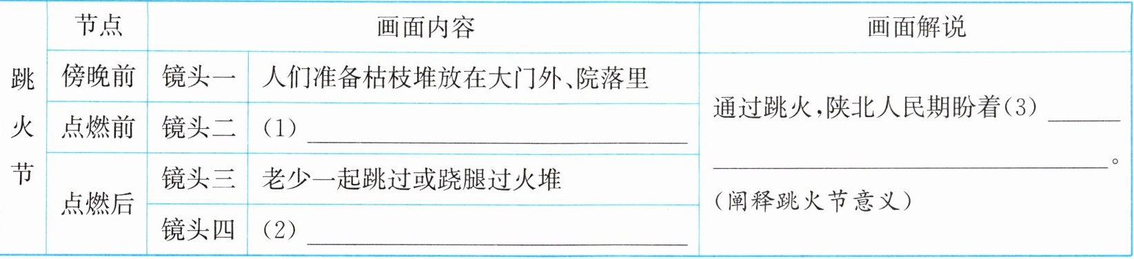 5. (1) 白日里准备吃食是跳火节的一部分,可以丰富观众对跳火节的了解。人们对吃食的讲究,体现了他们对跳火节的重视,为跳火仪式营造了节日氛围。同时也表现了人们对美好生活的向往和追求,与跳火节仪式的意义紧密相连。 (2) 示例一:甲句将菜品逐一罗列,表现了准备跳火节吃食的讲究与隆重,“诱”“挠”“绽放”等动词,从色泽、气味等角度生动表现了菜色的诱人,流露出人们的期待与喜悦。同时,“葱花花”“油碗碗”“蒜泥泥”等叠词的使用,充满了陕北的地方色彩。 示例二:乙句连用“铲”“掺”“撒”“浇”“搅”等动词,细腻地写出了吃“炒干”的过程,充满仪式感;“肠子香遍”“头发梢梢香软”等词句充满了陕北的地方色彩,夸张地写出了食物的喷香诱人,体现了生活的美好。