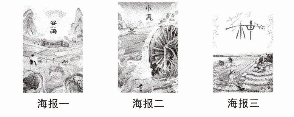 12. 新素养 审美创造 班级开展“二十四节气”主题活动,小文和小语设计了三款节气主题海报,准备在活动上展示。请你选择其中一幅海报,替他们介绍海报的构图、灵感来源和设计理念。