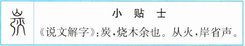 5. “炭”上面是“山”,下面有“火”,表示在山崖间伐木烧火,《说文解字》中也解释了“炭,烧木余也。从火,岸省声”