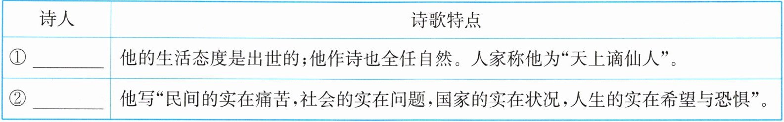 (1)《诗第十二》一章介绍了许多诗人及其诗歌的特点,小语向同学们展示了他制作的读书笔记,请你在下表的横线上填入合适的人名,使之与诗歌特点相符。
