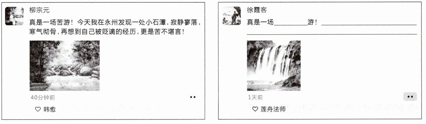 8. 假如徐霞客有朋友圈,你会看到什么内容呢? 请参照示例,在空缺处填入一个合适的字,再结合乙文,大胆想象,帮他把朋友圈补充完整。