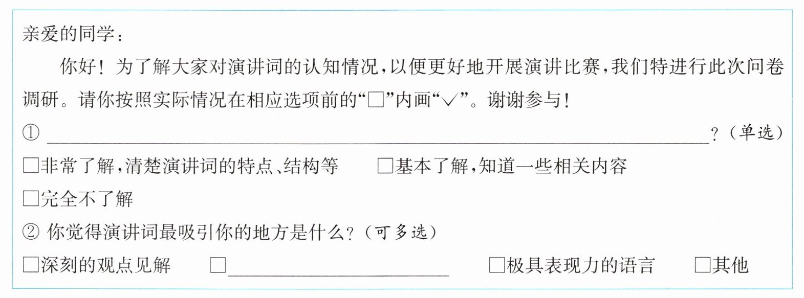 (1)新素养 思维能力 以下是校团委关于学生对演讲词认知情况的调查问卷,请你补充完整。