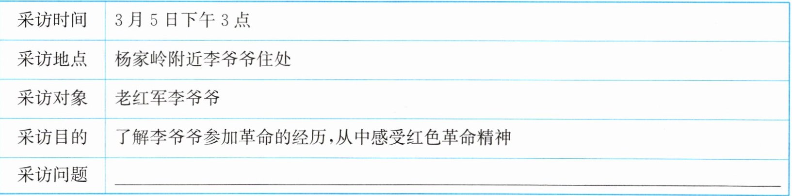 11. 同学们来到延安,参观了枣园、杨家岭等地,遇到了老红军李爷爷。小红想采访李爷爷,请你帮助她设计采访问题。