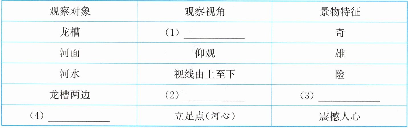4. 亮点原创 请借助表格,梳理“我”在枯水季节观瀑时的不同观察对象、观察视角和景物特征。