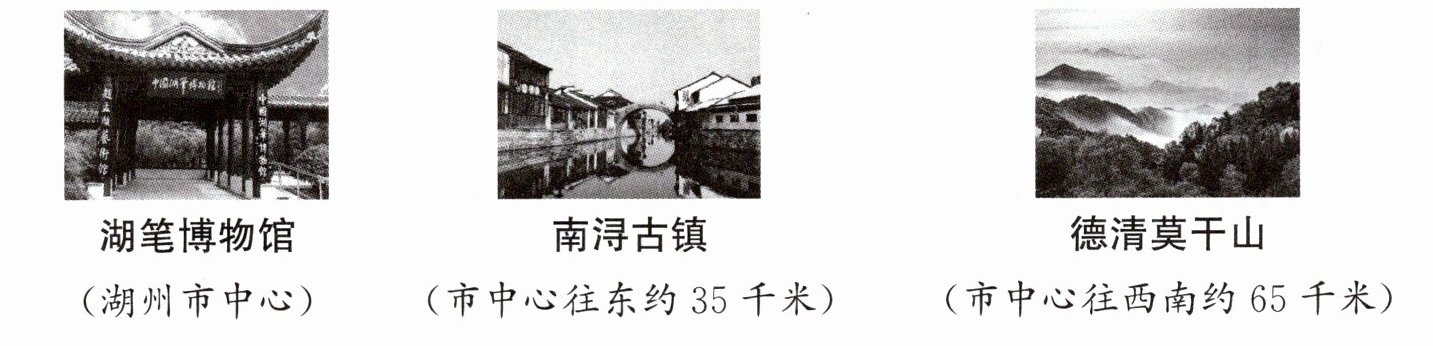 12. 新素养 思维能力 家住湖州市中心的晓华同学家里来了一位美国交流生汤姆。晓华想利用双休日,在家长的陪同下带汤姆出去游玩。晓华的家长建议去三个地方(见下图),感受湖州的“山水清丽,文化悠远”。请你根据下面的图片资料,帮助晓华设计“二日游”行程,并用文字表述出来。要求:行程设计合理,有主题;语言表达简洁,有条理;120 字左右。