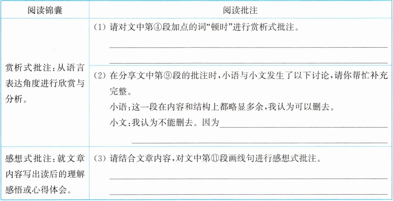 11. 做批注是非常好的读书方法,请根据下面表格中的“阅读锦囊”完成阅读批注。