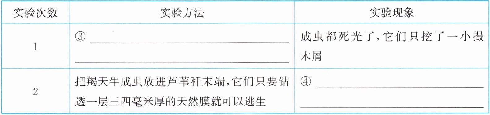 答案:6. (1)①被关在树干里的羯天牛成虫能否给自己挖出一条逃生通道?②羯天牛成虫能够挖出逃生通道。③把橡木劈成两半,挖出大小合适的坑;把刚刚化蛹的骑士羯天牛放进去,再把两半木头合起来,用铁丝固定④只有少数逃了出来⑤羯天牛幼虫预知成虫无法在橡树中挖出通道,于是提前准备好逃生通道(2)运用列数字的说明方法,具体准确地说明了羯天牛蛹室的宽大,体现了法布尔细致严谨、一丝不苟的科学精神。