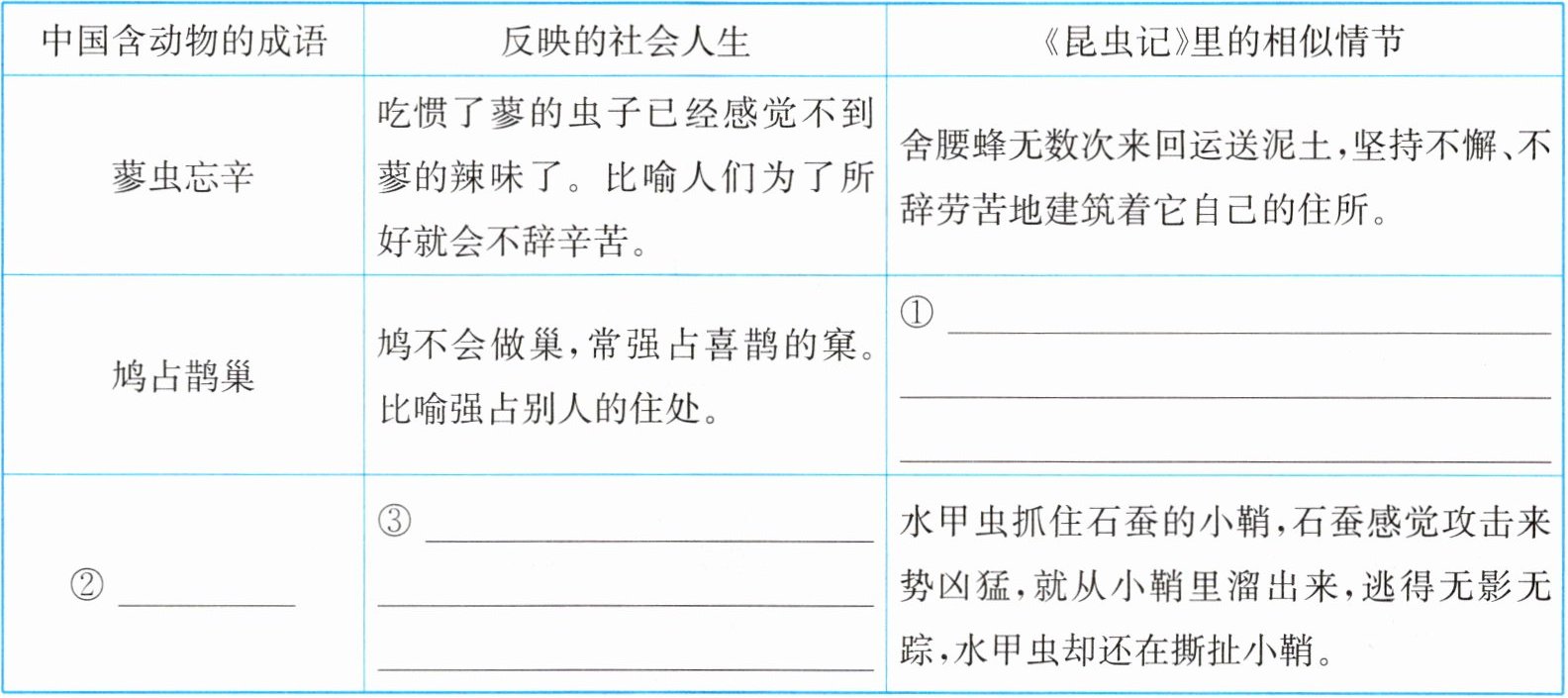 (2)亮点原创·【环节二:名著里的“人生”】法布尔的《昆虫记》以人性观照虫性,又以虫性反映社会人生。小文同学在研读《昆虫记》时,发现中国也有些含动物的成语体现了人性,折射出社会人生。她为此做了一张表格,请你根据示例,帮她完善。