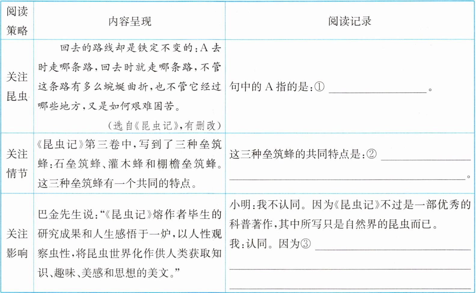 (1)新趋势 脉络梳理 阅读《昆虫记》,小江总结了法布尔科学探究的基本经验。法布尔的研究基本遵循了“提出问题—分析猜想—实验验证—得出结论”的过程。请完成选段中的研究过程。