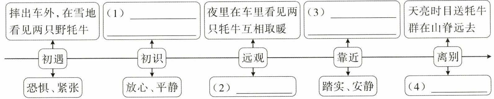 13. 新趋势思维导图【理相遇轨迹,感心路历程】为了取景,请帮忙梳理“我”和野牦牛相遇的有关情节和“我”的心理变化过程,完成思维导图。(4 分)