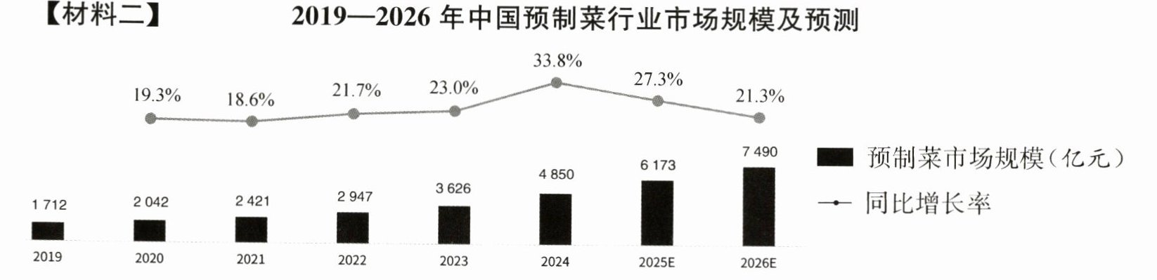 答案:11. B 【解析】根据材料二“同比增长率”折线图可知,“2024”为“33.8%”、“2025E”为“27.3%”、“2026E”为“21.3%”,2024年以后中国预制菜行业市场规模同比增长幅度减小,而非“市场规模开始逐年缩小”。