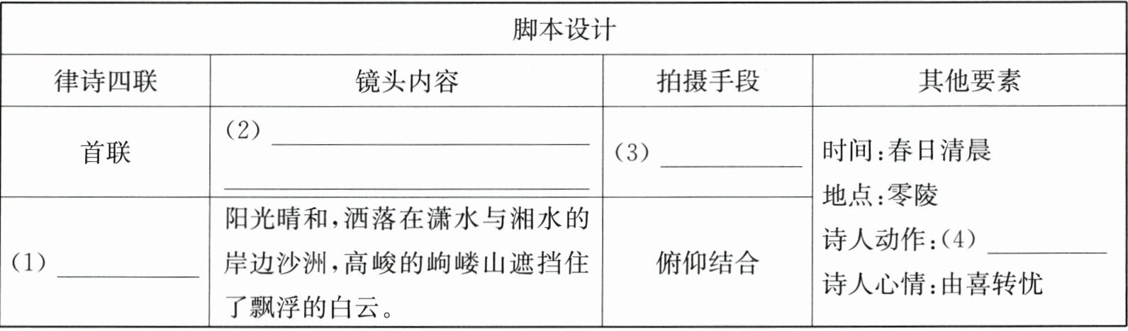 4. 亮点原创 同学们想用短视频的形式拍摄这首诗的画面,请你完成下面的脚本设计。(4 分)