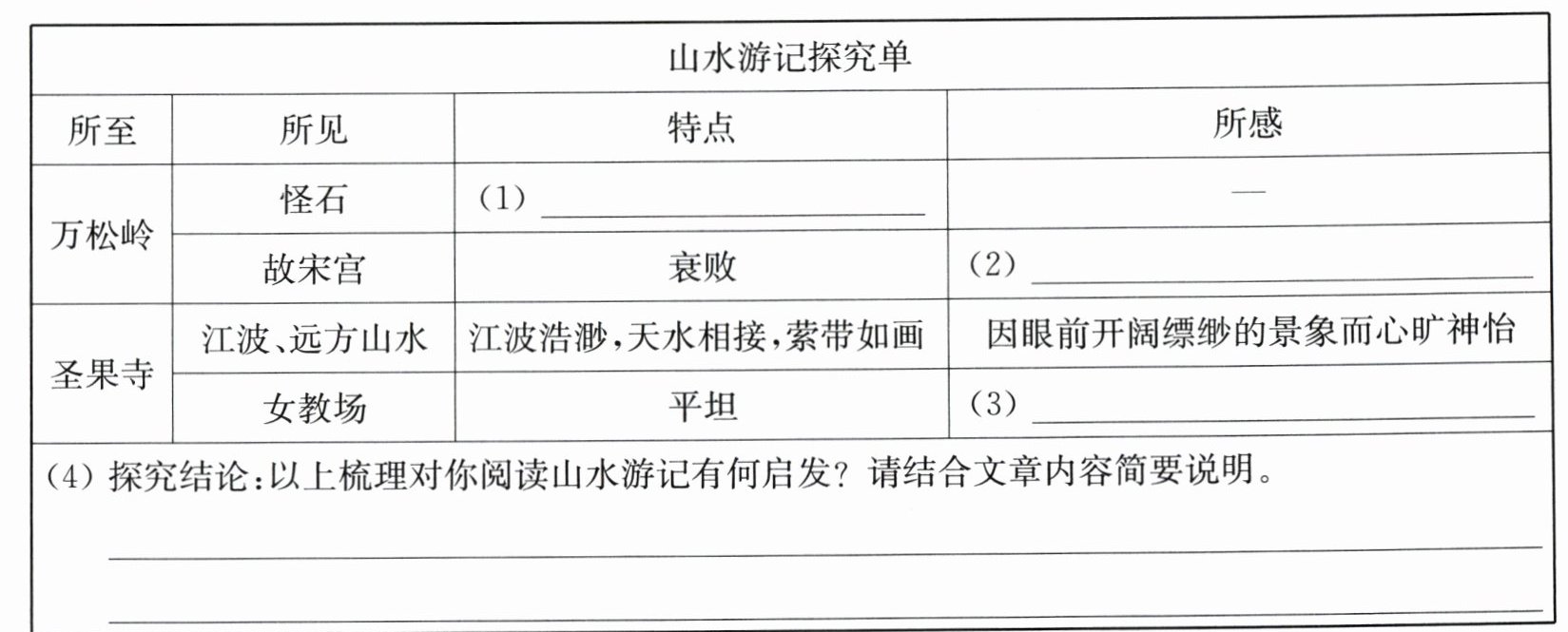 9. 请你根据文章内容补全山水游记探究单。(4 分)