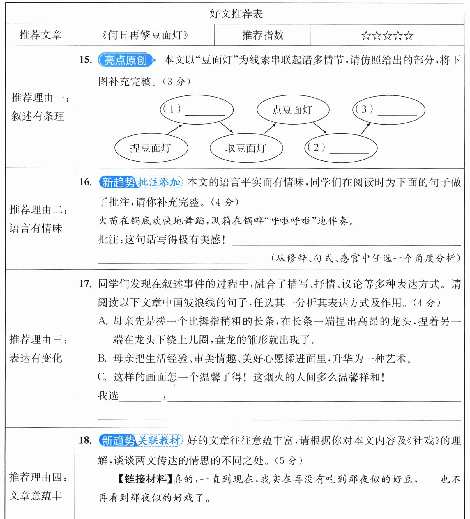 18. 本文展现了农家人对人寿年丰的祈盼,流露出对勤劳能干、热爱生活、追求美好的母亲的爱与赞美,对远离家乡、难以再感受擎豆面灯的快乐的无奈与伤感。《社戏》展现了对美好自然景象的喜爱与赞美,对精神富足、人情醇厚的理想社会的向往与追寻。