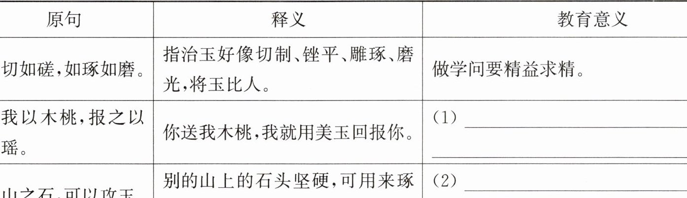 20. 诗歌组学习了《〈诗经〉第四》这一篇的内容,并结合语文素养积累,绘制了下表,以体会“诗言志”的育人作用。请你帮助他们完善表格。