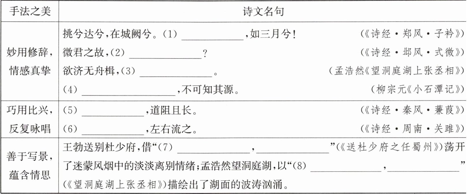 4. (2025·江苏无锡期中)为响应学校发布的研学任务,班级举办“赏手法之美,品诗词真情”的诗歌朗诵活动,下面是小文对部分选手作品的分类整理,请你帮助他完成表格空缺处的诗句填写。