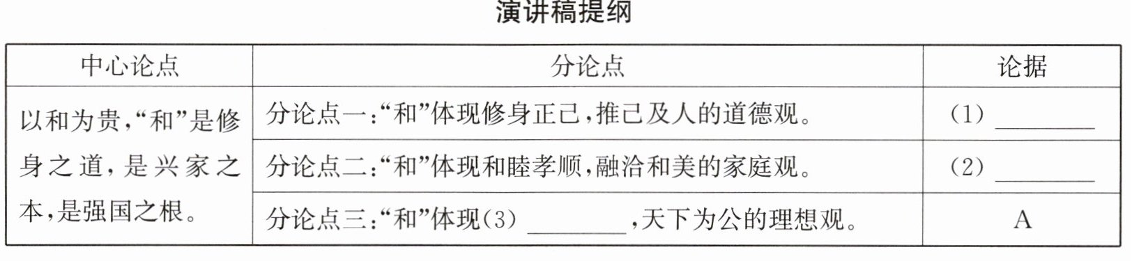 20. 下面是某同学题为《以和为贵》的演讲稿提纲,请从所给选项中为演讲稿提纲的分论点一、二选择恰当的论据,并根据论据将分论点三补充