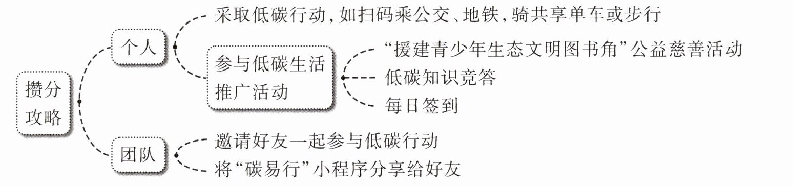8. 新素养 语言运用 为引导同学们践行低碳生活理念,学校正式启用“碳易行”小程序。 小语想在小程序中获取更多的碳积分为低碳生活助力,请你结合下图,向她介绍你整理的攒分攻略。
