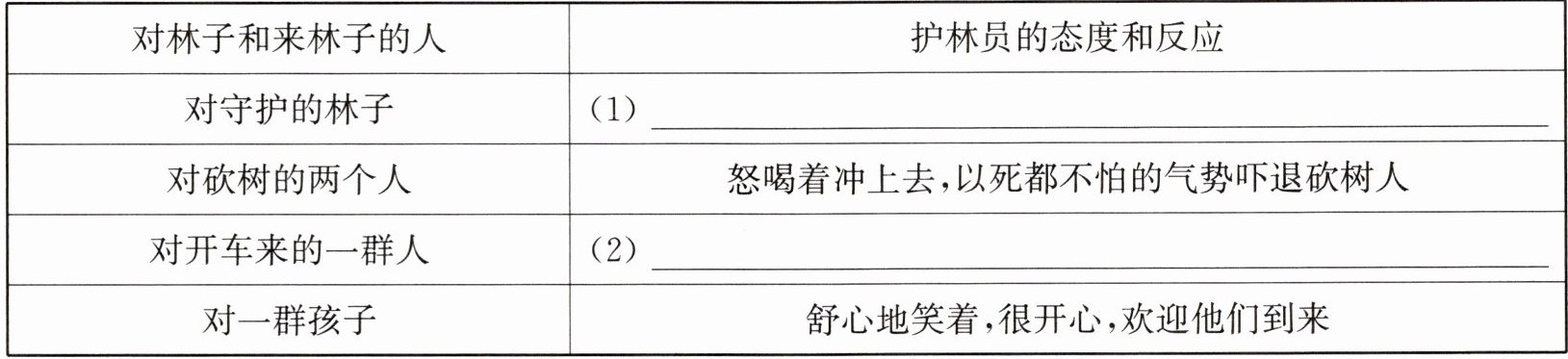 答案:4. (1)像老朋友,听林子里的万物说话,细心呵护林中的动植物 (2)感到害怕、担心,开心不起来,不欢迎他们到来