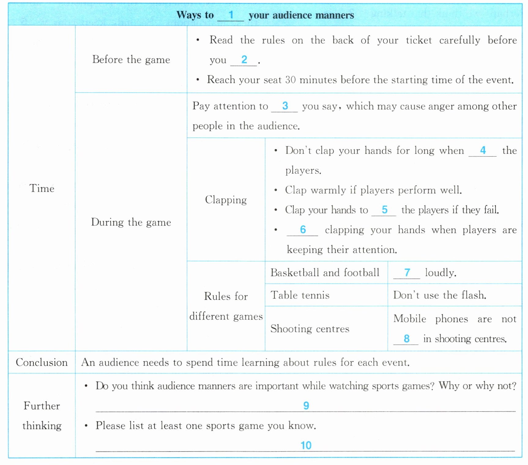 答案:1. improve 2. arrive 3. what 4. welcoming 5. encourage 6. Avoid/Stop 7. Cheer 8. allowed 9. Yes, I think audience manners are important. Because good manners can show respect for players and coaches.(答案不唯一,言之有理即可) 10. The Olympic Games and FIFA World Cup.(答案不唯一,言之有理即可)
