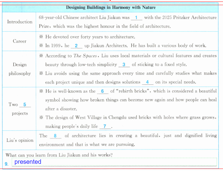 Rather than following a distinct名师精讲 style,Liu's projects include local elements and rely on “low-tech” simplicity to achieve beauty,The Spaces reported. “He has developed a strategy that never bases on a recurring(反复出现的)method but rather on evaluating the specific characteristics and requirements of each project differently,” the jury(评审团)said in its citation announcing the award.