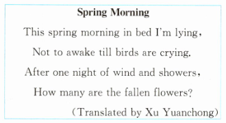 大约1300年前,孟浩然在他的诗中使用了简单通俗的文字。他只是描述了春天里能看到和听到的事物,比如鸟儿的歌声以及风雨的声音。但通过这些简单的描写,他表达了自己对自然深深的热爱。同时,他也让我们感受到他对美好事物消逝(比如落花)的悲伤。