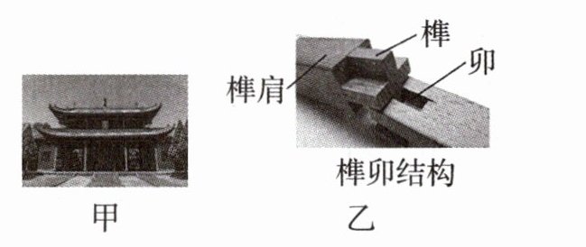 4. (2025·江西赣州期中)赣州文庙始建于宋朝年间,图甲是文庙内的大成殿,整个建筑未使用钉子,而是采用榫卯结构(如图乙)连接支撑.榫的接入部分的宽度略大于卯的宽度,插入时通过增大_______的方式来增大摩擦,防止脱落;屋内木质建筑的边缘部分一般是圆角设计,既美观的同时也能通过增大_______的方式减小碰撞时的压强.