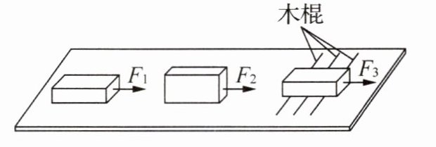 12. (2025·山东青岛一模)在研究摩擦力的实验中,小明在同一水平面上对一个各侧面光滑程度相同的木块进行了如图所示的实验。当用弹簧测力计水平拉木块做匀速直线运动时,弹簧测力计的示数分别为$F_{1}$、$F_{2}$、$F_{3}$,它们之间的大小关系是_______;图中拉力$F_{1}$的大小为$8N$时,木块做匀速直线运动,若将拉力$F_{1}$增大到$10N$时,木块受到的摩擦力大小将_______。
