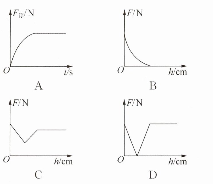 9. (2025·江苏南通三模)如图,弹簧的一端固定在装水的容器底,另一端连着物体,水面刚好与物体下表面相平。向容器中逐渐加水,设水面与物体底边距离为h,加水的时间为t,弹簧对物体的作用力为F,物体受到的浮力为F浮。下列图像中不可能正确的是( )