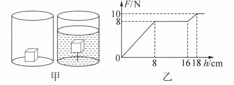 3. (2025·福建模拟)将一棱长为 10 cm 的立方体木块(木块不吸水),用轻绳(不可伸长)拴在底面积为 200 cm² 的薄壁容器底部,向足够高的容器中逐渐加水,如图甲所示,在这一过程中,木块受到的浮力 F 随水的深度 h 变化的图像如图乙所示,由图可知木块的重力为_______N,当 h = 20 cm 时剪断轻绳,木块静止时水对容器底部的压强减小了_______Pa。(ρ₍水₎ = 1.0×10³ kg/m³,g 取 10 N/kg)