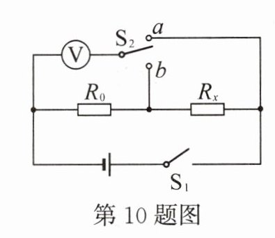 10. 如图所示电路中,电阻 $ R_0 = 12\ \Omega $,闭合开关 $ S_1 $,将单刀双掷开关 $ S_2 $ 掷于 $ a $ 端,电压表示数为 $ 2.5\ \mathrm{V} $;将 $ S_2 $ 切换到 $ b $ 端,电压表示数为 $ 1.5\ \mathrm{V} $. 则电源电压为