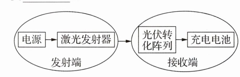 s.答案:11. 电 53 280 180 解析:光伏转化阵列将光能转化为电能,给电池充电.无人机电池充满电后存储的电能 $W = UIt = 3.7 \mathrm{ V} × 4 \mathrm{ A} × 3 600 \mathrm{ s} = 53 280 \mathrm{ J}$;若发射端的发射功率为 $370 \mathrm{ W}$,从发射端到接收端的传输效率为 $50\%$,则接收端的功率 $P_{收} = \eta P_{发} = 50\% × 370 \mathrm{ W} = 185 \mathrm{ W}$,接收端的充电效率为 $80\%$,则接收端的充电功率 $P_{充} = \eta'P_{收} = 80\% × 185 \mathrm{ W} = 148 \mathrm{ W}$,由 $P = \frac{W}{t}$ 可得,将该电池的电能从 $50\%$ 充满需要的时间 $t = \frac{W'}{P_{充}} = \frac{50\%W}{P_{充}} = \frac{50\% × 53 280 \mathrm{ J}}{148 \mathrm{ W}} = 180 \mathrm{ s}$.
