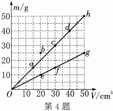 4. (2024·宿迁沭阳校级三模)小文同学找来了多个不同的实心物体($a$、$b$、$c$、$d$、$e$、$f$、$g$、$h$)用天平测量了它们的质量和体积,并把测量的对应数据绘制成了图像(如图),获得的信息不正确的是(