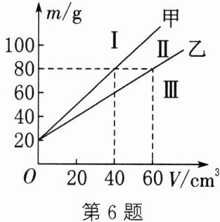 6. (2025·苏州期中)小明研究液体密度时,用两个完全相同的容器分别装入甲、乙两种液体,并绘制出总质量$m$与液体体积$V$的关系如图所示,由图像可知(