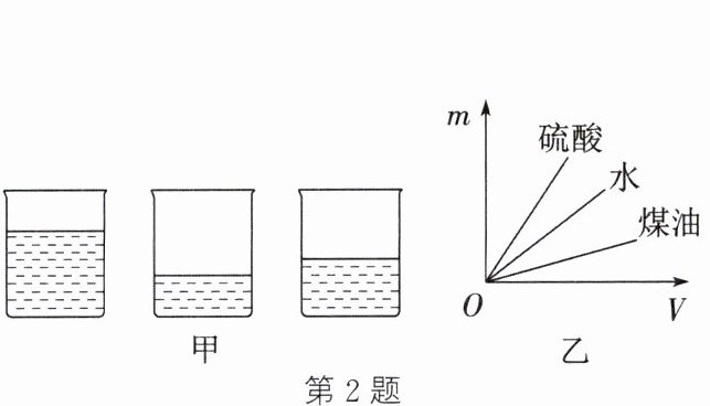 2. (2025·常州期中)如图甲中的三只相同烧杯内分别装有质量相等的硫酸、水、煤油,它们的质量与体积的关系如图乙,则从左至右三只烧杯中的液体依次是(